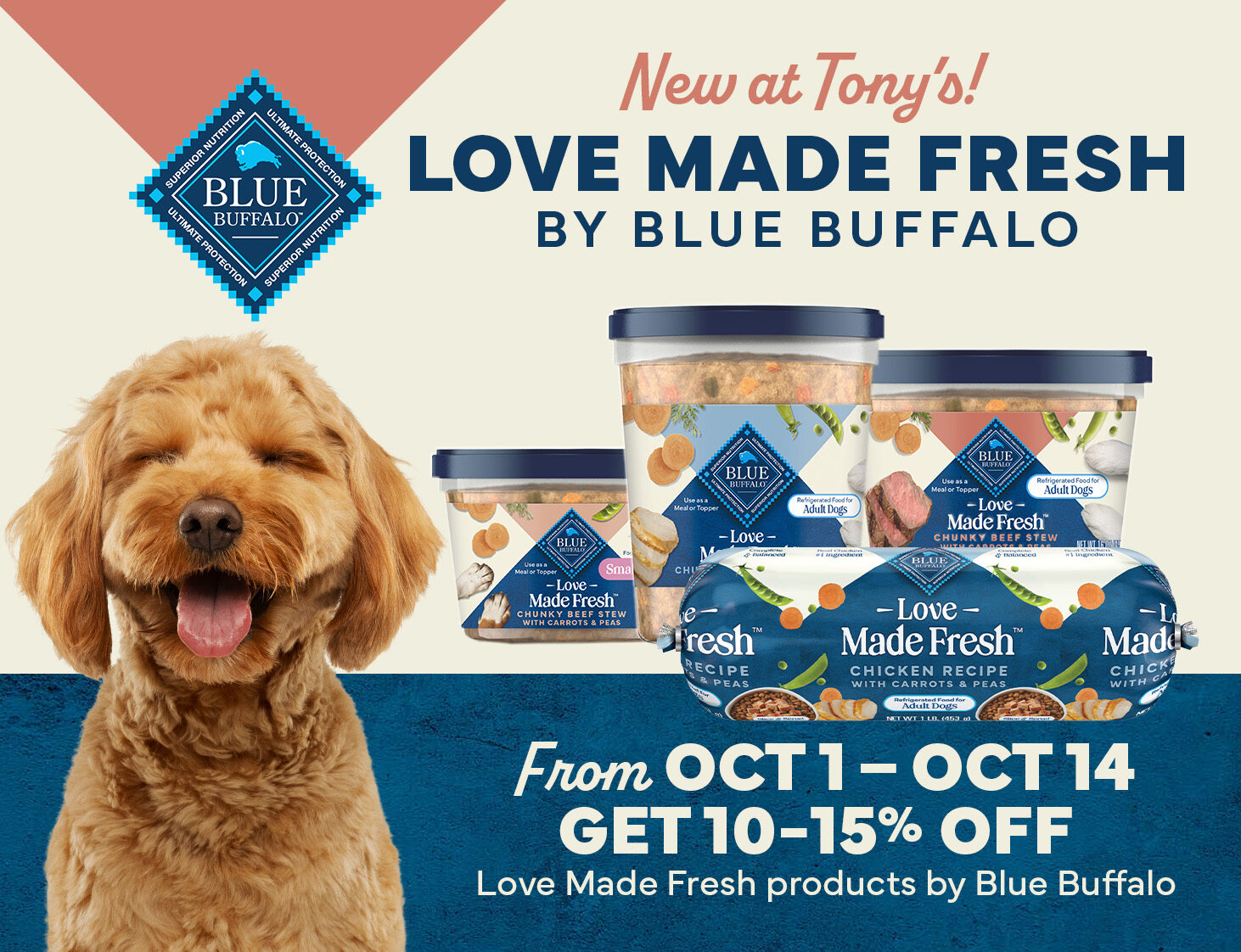 Get 10 – 15% OFF Love Made Fresh products by Blue Buffalo. From October 1st – October 14th, 2025 at your nearest Tony’s Fresh Market!
