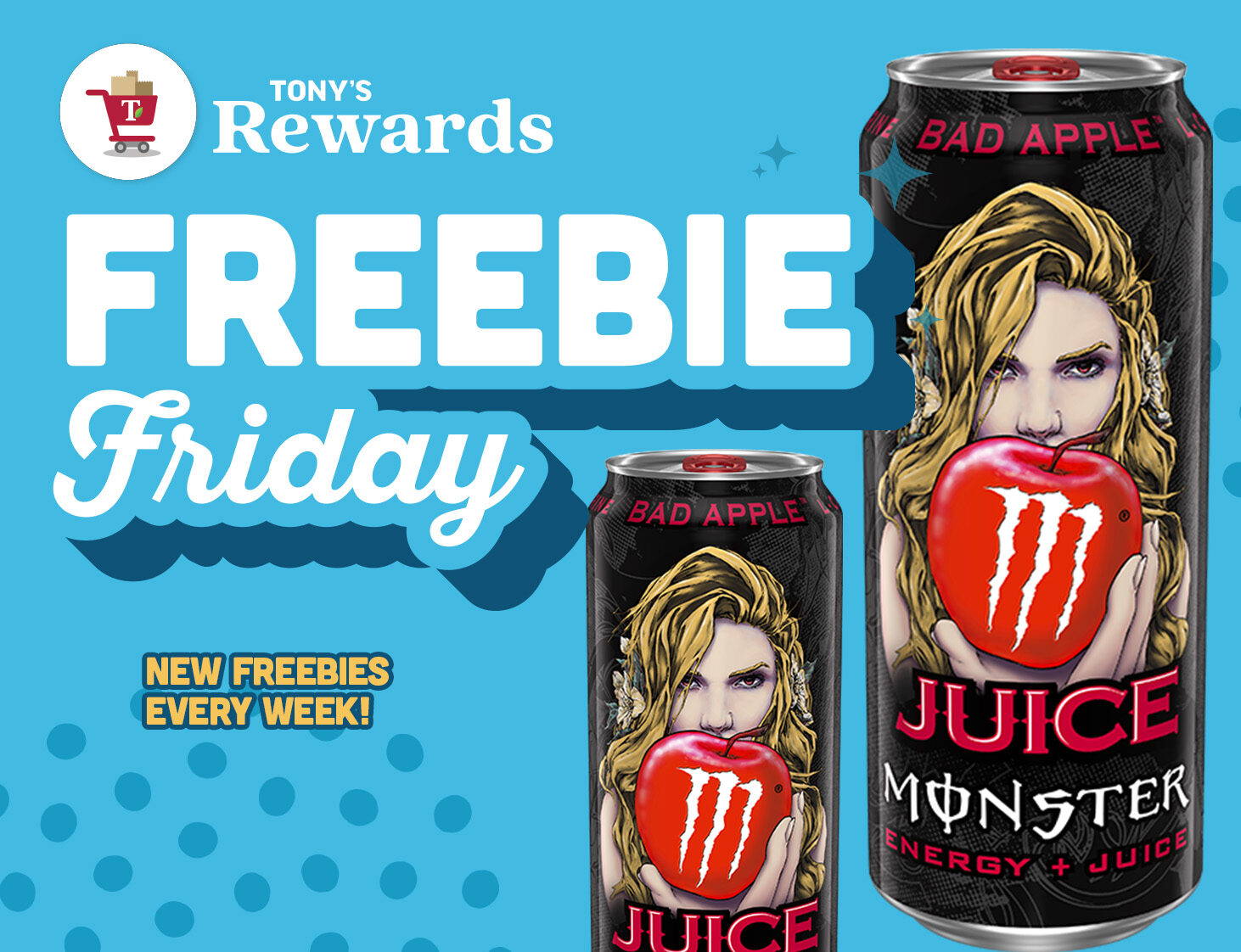 From 10/24 – 10/26 GET 1 FREE 16 oz MONSTER BAD APPLE when you clip your digital coupon and enter your rewards number at checkout. You can now access this offer in your Tony’s Rewards App!