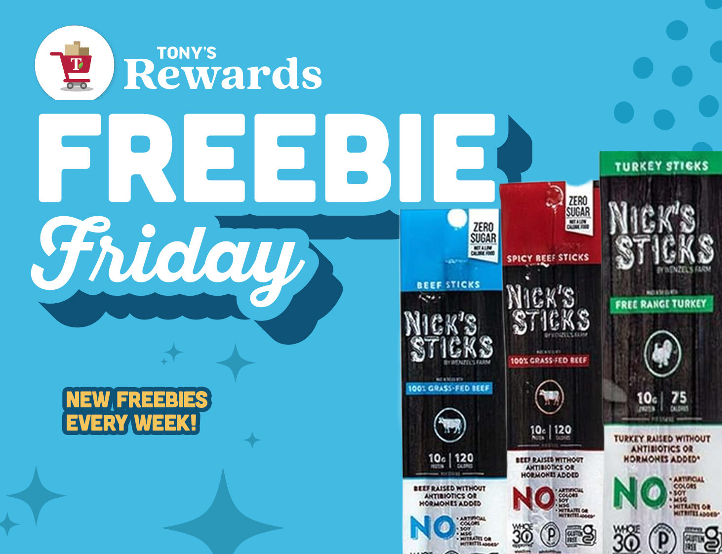 Get 1 FREE 1.7 oz NICK’S GRASS FED MEAT STICKS when you clip your digital coupon and enter your rewards number at checkout. You can access this offer in your Tony’s Rewards App!