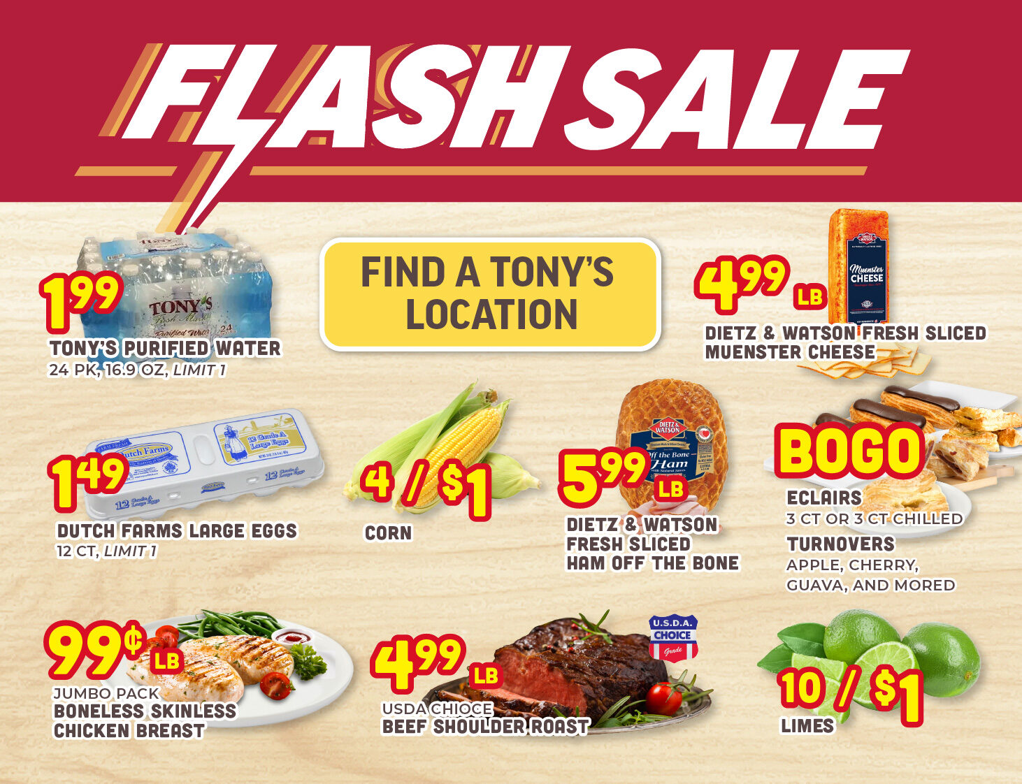Stop by your nearest Tony’s location and shop our FLASH SALE! From 11/1 – 11-2 you’ll get great deals on eggs, produce, meat and more.